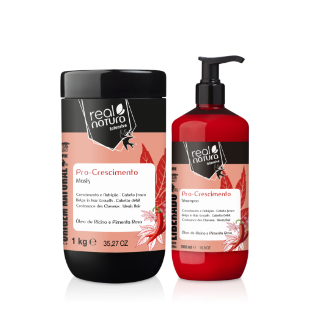 The Castor Oil & Pink Pepper Hair Growth Treatment Set from Real Natura is designed to stimulate hair growth, strengthen strands, and revitalize the scalp. The formula combines two powerful ingredients: castor oil, known for its fortifying and shine-enhancing properties, and pink pepper, which provides gentle cleansing, hydration, and shine. The set includes a 500 ml shampoo and a 1 kg mask, specially adapted for fragile hair or hair with a slow growth rate.